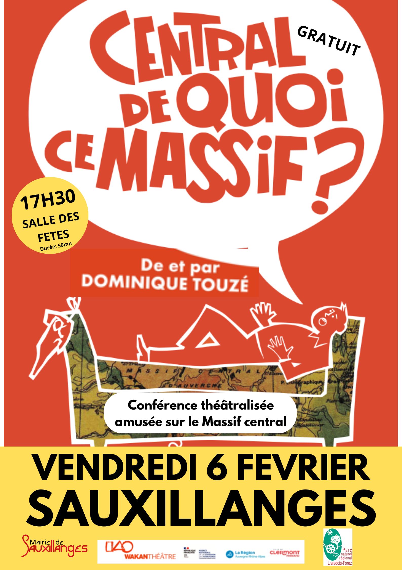 Pour clôturer ce travail, le Parc naturel régional Livradois-Forez vous donne rendez-vous le vendredi 6 février à 17h30 pour le spectacle « Central de quoi ce Massif ? », une conférence théâtralisée sur le Massif central. Le spectacle explore les identités du Massif central, « montagne habitée à tous les étages », et de ses habitants, notamment par rapport aux grandes villes. En conjuguant sociologie, politique, rigueur scientifique et confidences sur sa propre expérience, Dominique Touzé met en lumière ce qui fait l’existence du Massif central.