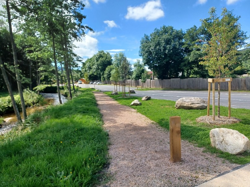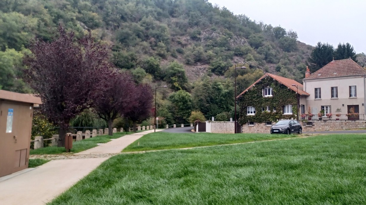 À Auzon, la place de la Barreyre a été entièrement transformée. Ancien parking en enrobé, elle accueille désormais un vaste espace végétalisé qui favorise l’infiltration des eaux de pluie dans le sol plutôt que leur ruissellement vers la rivière Auzon. Ce nouvel aménagement contribue également à atténuer les effets de chaleur et à offrir un meilleur confort aux habitants comme aux visiteurs.