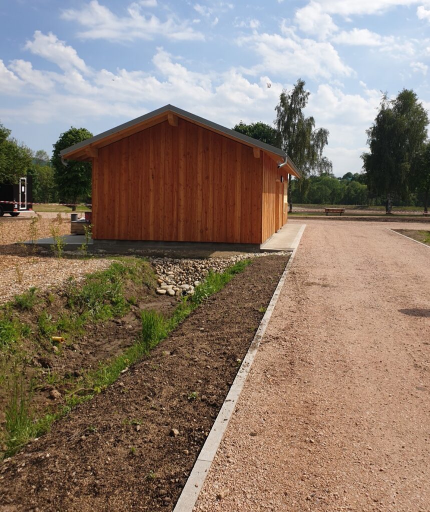 Au plan d’eau de Saint-Anthème, le parking visiteurs a été partiellement désimperméabilisé en bord de rivière afin de permettre la temporisation des eaux pluviales dans une surface végétalisée. Les eaux de toiture du bâtiment d’accueil sont quant à elles dirigées vers une noue paysagère (sorte de fossé végétalisé qui recueille temporairement les eaux de ruissellement) qui structure l’entrée du site.