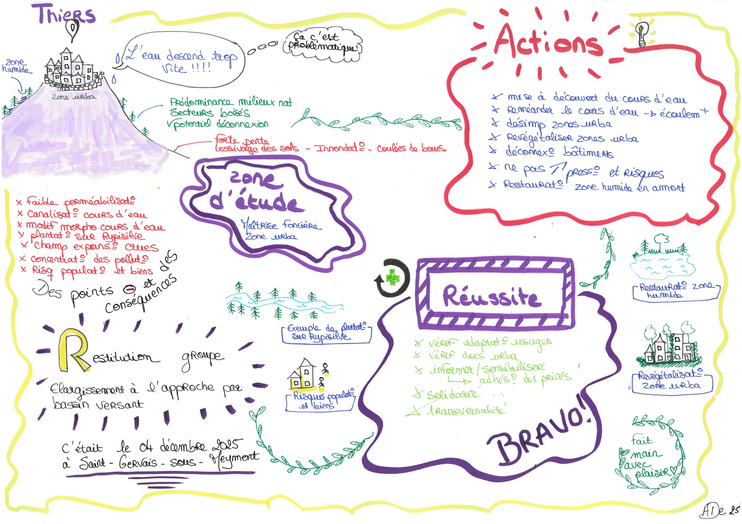 En parallèle, il a été proposé aux participants de travailler sur la place de l’eau dans le petit et le grand paysage sur la commune de Saint-Gervais-sous-Meymont. Cet atelier a été l‘occasion d’établir les corridors de ruissellement et de réfléchir à des pistes d’actions afin de favoriser l’infiltration de l’eau et le ralentissement de celle-ci, pour éviter in fine les inondations. Cette lecture a permis de prendre en compte l’importance de la gestion de l’eau dans les projets d’aménagement.