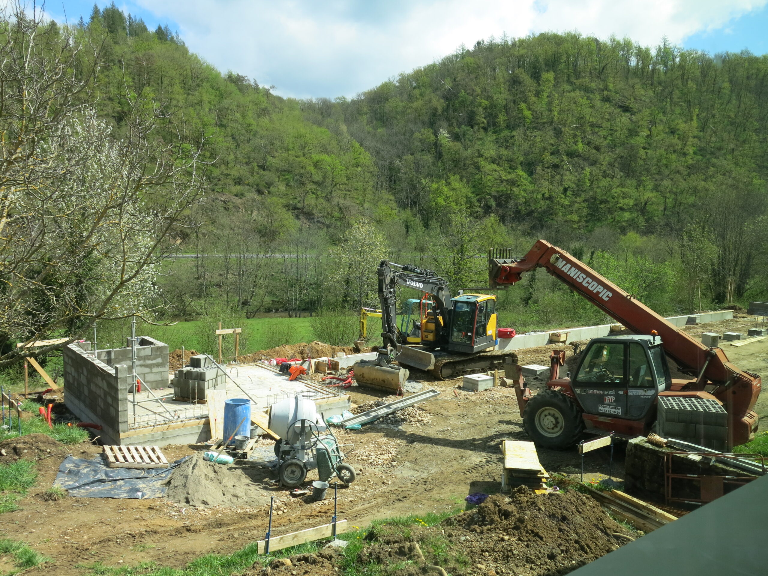 Après l’étape de fondations en février, les travaux de gros œuvre ont pris la suite : maçonnerie semi-enterrée et aménagement des réseaux enterrés (électricité, eaux pluviales).