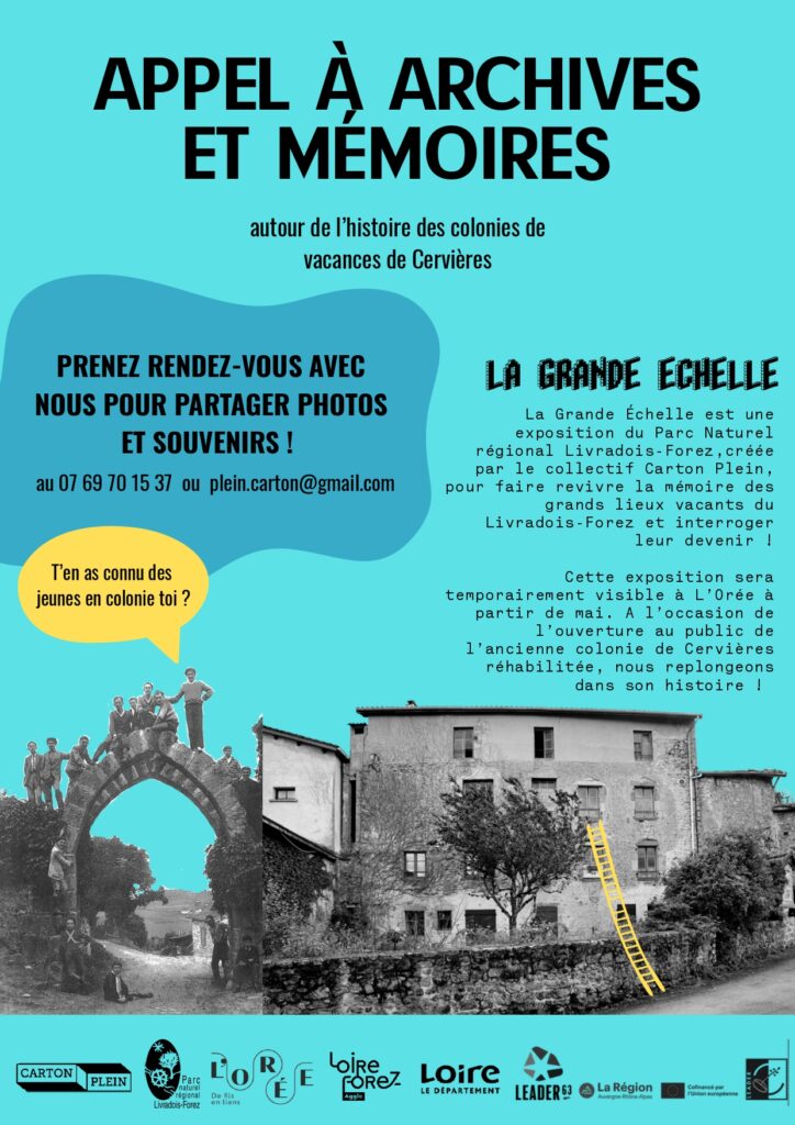Si vous souhaitez participer au travail de mémoires sur les colonies de vacances de Cervières ou accueillir l’exposition sur votre commune ou votre lieu, n’hésitez pas à nous contacter à v.arthaud@parc-livradois-forez.org.