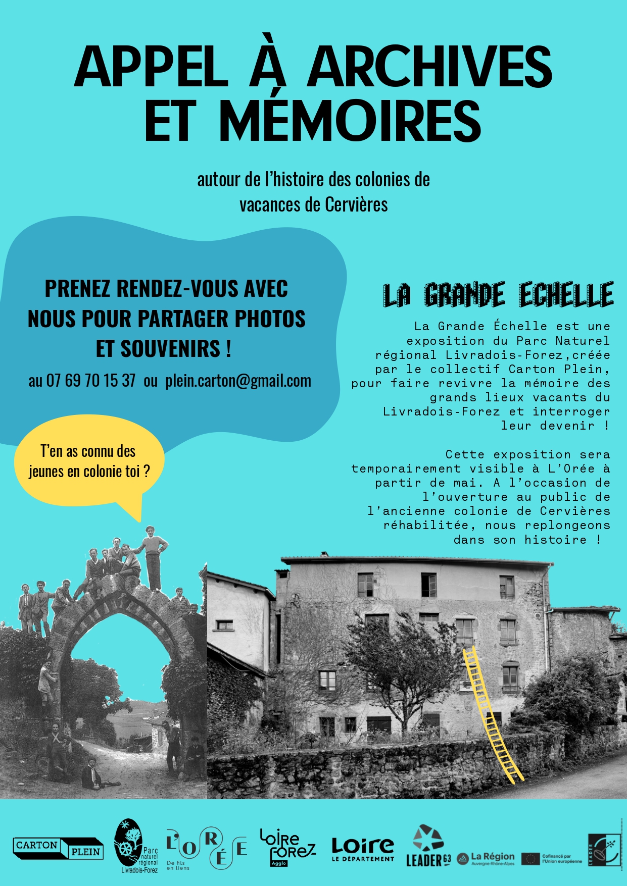 La Grande Échelle, c’est un voyage à travers l’histoire et le devenir des grands lieux d’accueil touristique, sanitaire et social du Massif central. En mai, l’exposition s’installera à Cervières : un appel à mémoires et archives autour de l’histoire des colonies de vacances de la commune est lancé !