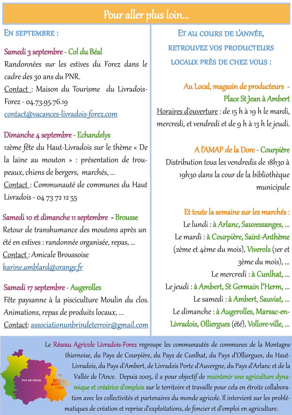Pour aller plus loin : Vous souhaitez en savoir davantage sur les agriculteurs qui animent votre territoire ? Rendez-vous le 23 septembre, à Saint-Gervais-sous-Meymont, pour une soirée placée sous le signe de la découverte, de l’échange et de la gourmandise ! N’hésitez pas à partager l’information autour de vous !